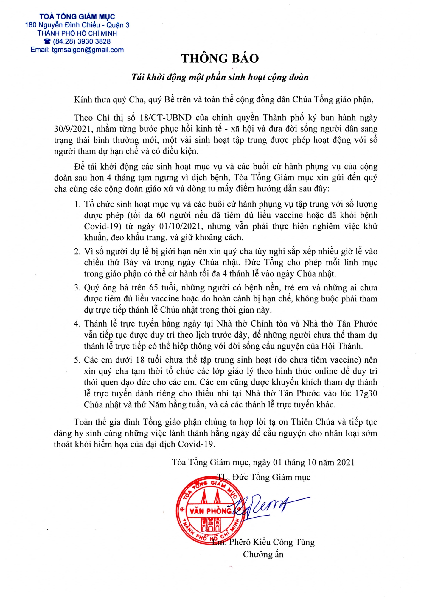 - Tổ chức sinh hoạt mục vụ và các buổi cử hành phụng vụ tập trung với số lượng được phép (tối đa 60 người nếu đã tiêm đủ liều vaccine hoặc đã khỏi bệnh Covid-19) từ ngày 01/10/2021, nhưng vẫn phải thực hiện nghiêm việc khử khuẩn, đeo khẩu trang, và giữ khoảng cách.