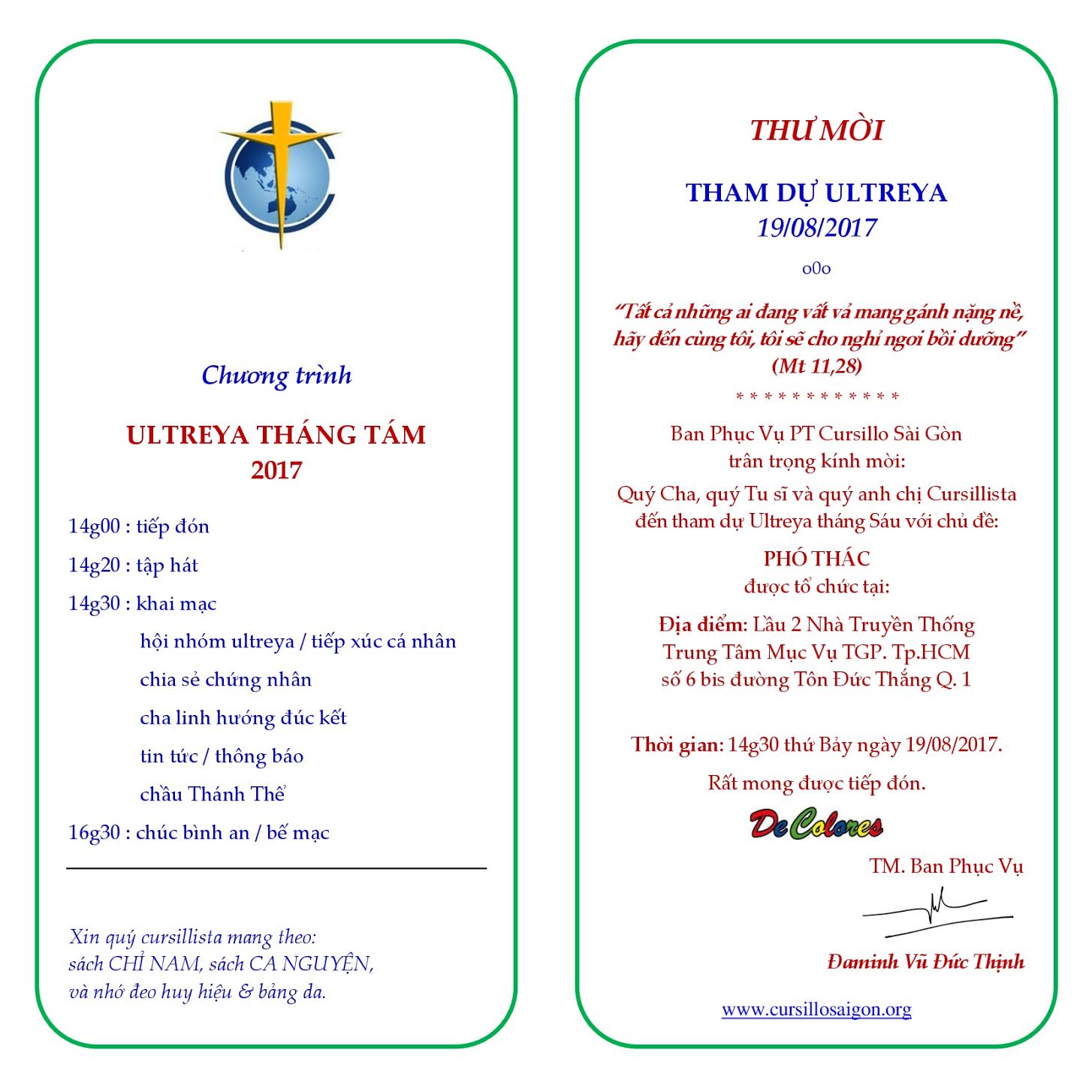 THƯ MỜI THAM DỰ ULTREYA THÁNG TÁM NĂM 2017: