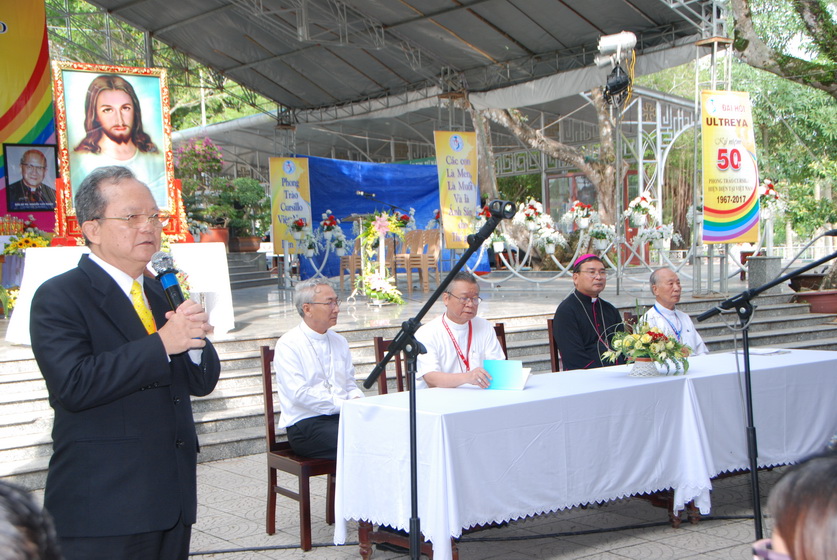 Sau những giây phút sôi động, Đại hội lắng đọng chào đón Đức Ông Vinh-sơn Đặng Văn Tú, Giáo phận Xuân Lộc. Ngài kể lại lược sử Phong trào Cursillo Việt Nam.