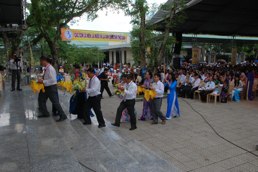 Anh Đaminh Vũ Đức Thịnh - Trưởng BTC - cùng 8 anh chị Cursillista GP Vinh dẫn đầu đoàn rước đồng tế tiến lên lễ đài.