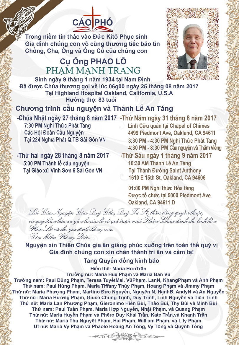 Trong niềm tin vào Chúa Kitô tử nạn và phục sinh để cứu chuộc muôn loài, kính xin quý Cha, quý Tu sĩ và quý Anh Chị hiệp lời cầu nguyện cho linh hồn Phao-lô được mau về hưởng hạnh phúc vĩnh cửu với Chúa và các Thần Thánh trên Thiên đàng.