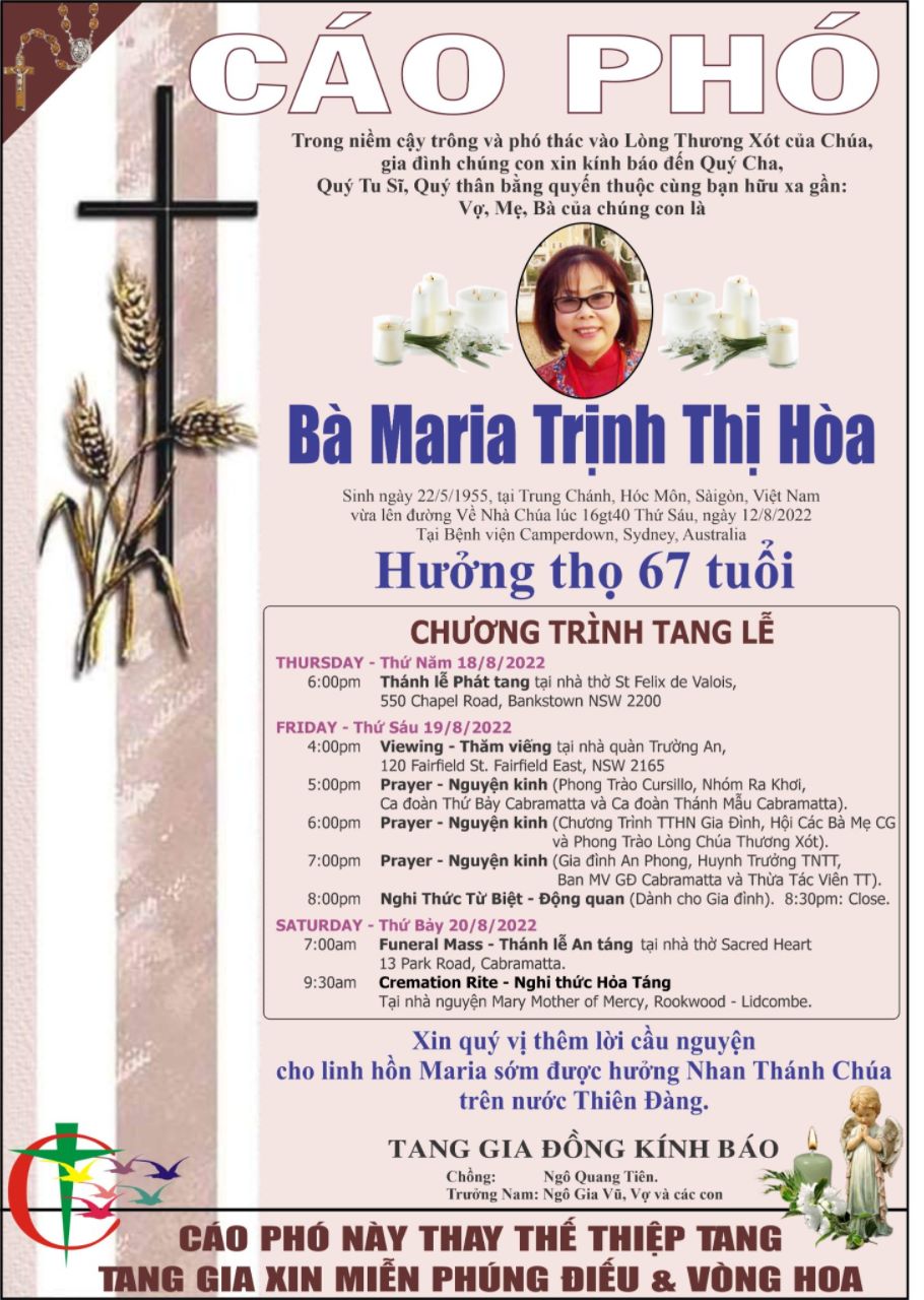 Kính xin quý cha LH, quý Tu sĩ cùng ACE Cursillista hiệp ý cầu nguyện cho linh hồn Maria được sớm vui hưởng Ngày thứ Năm trong Nước Chúa.