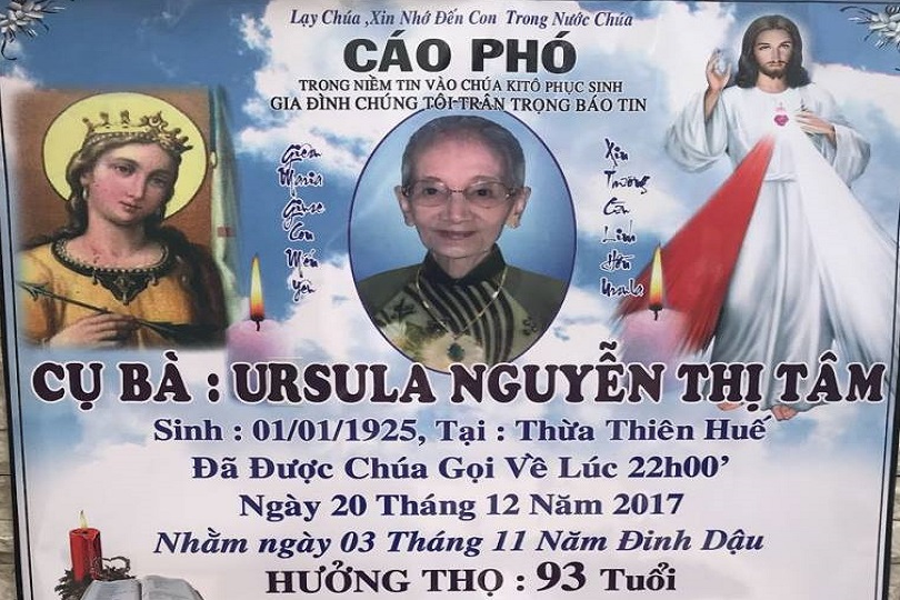 Cụ Bà URSULA NGUYỄN THỊ TÂM, là mẹ Cursillista An-tôn Lê Minh (#01SG), mẹ chồng Cursillista An-na Dương Kim Ánh (#04) đã được Chúa thương gọi về ngày 20/12/2017, hưởng thọ 93 tuổi.