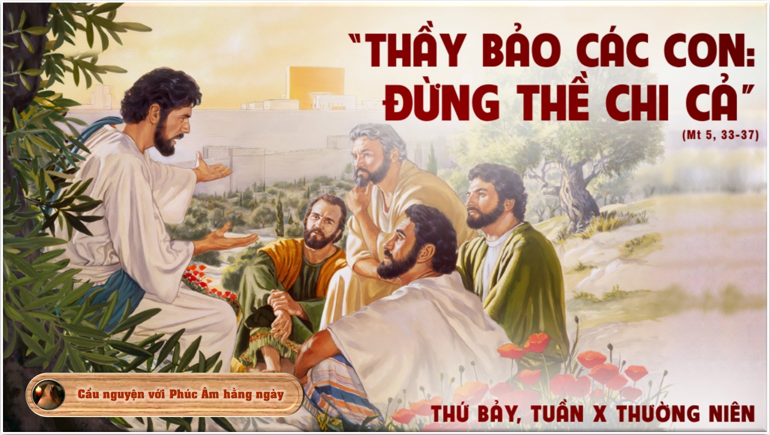 Khi ấy, Chúa Giêsu phán cùng các môn đệ rằng: "Các con lại còn nghe dạy người xưa rằng: "Ðừng bội thề, nhưng hãy giữ lời ngươi đã thề với Chúa". Phần Thầy, Thầy bảo các con: Ðừng thề chi cả, đừng lấy trời mà thề, vì là ngai của Thiên Chúa; đừng lấy đất mà thề, vì là bệ đặt chân của Người; đừng lấy Giêrusalem mà thề, vì là thành của Vua cao cả; cũng đừng chỉ đầu mà thề, vì con không thể làm cho một sợi tóc ra trắng hoặc ra đen được. Nhưng lời các con phải: có thì nói có, không thì nói không; nói thêm thắt là do sự dữ mà ra".