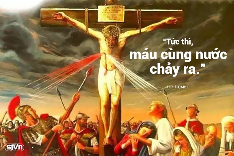 "Tên lính đâm thủng cạnh sườn Người, và máu cùng nước chảy ra".